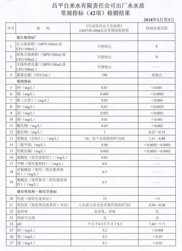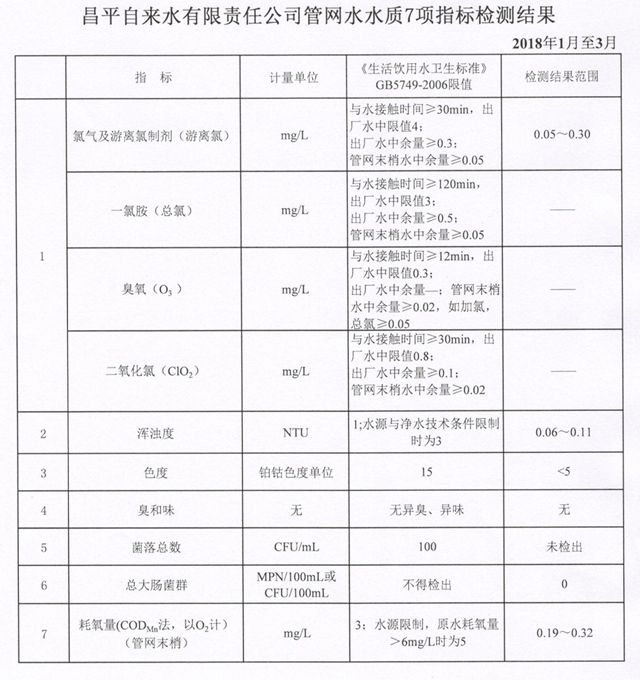 2018年第一季度北京市昌平自来水有限责任公司水质公告