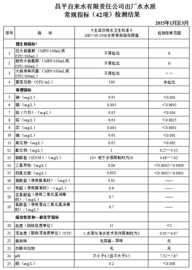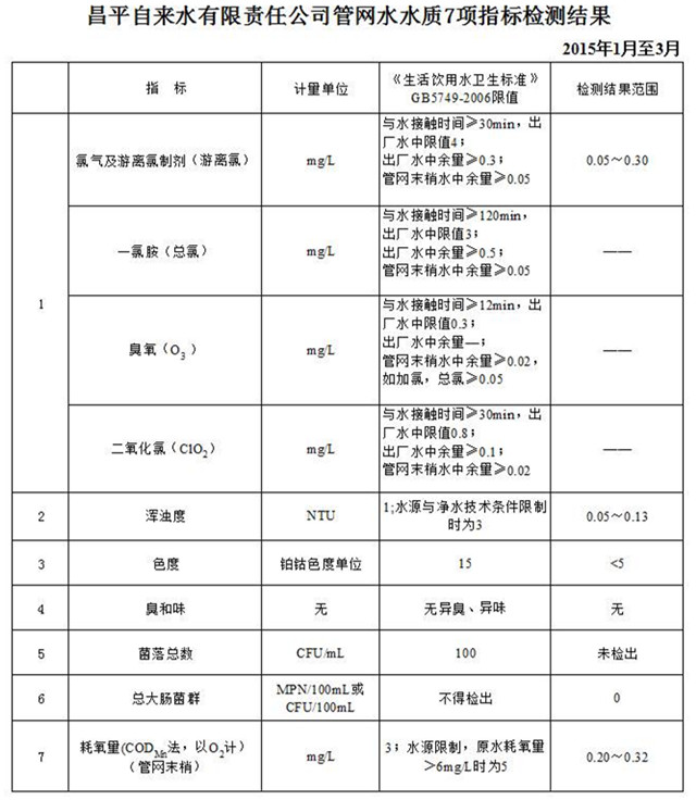 2015年第一季度昌平自来水有限责任公司水质公告