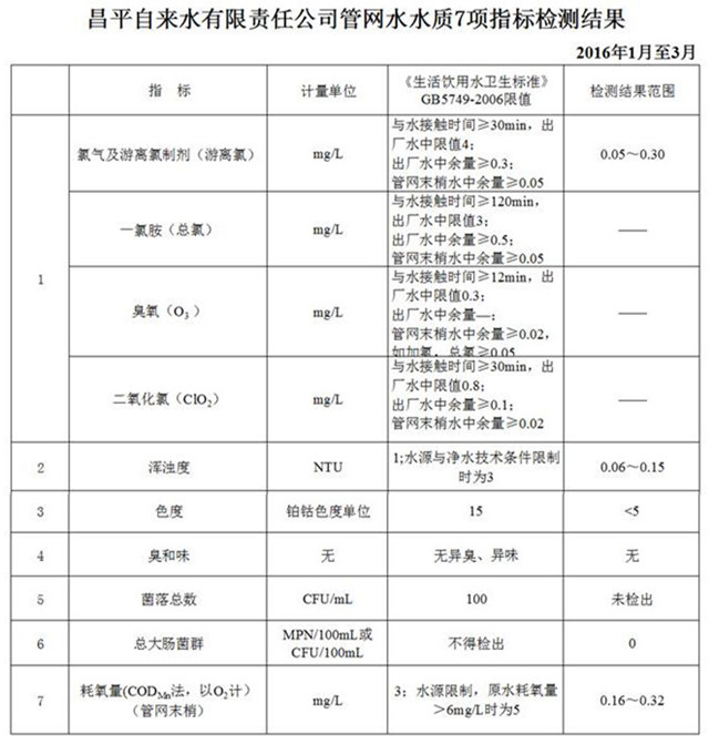 2016年第一季度昌平自来水有限责任公司水质公告