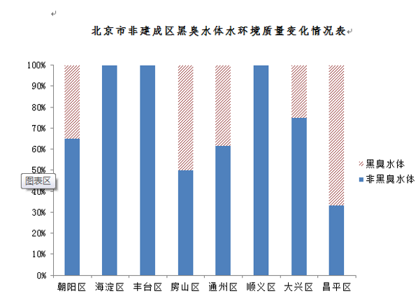 全市非建成区84条段黑臭水体中,经治理变为非黑臭水体的57条段,占67.9%。其中达到黑臭水体治理标准的水体32条段,无水河段25条段。仍为黑臭的水体27条段,占32.1%。其中轻度黑臭水体20条段,重度黑臭水体7条段。各相关区达到非黑臭水质标准河段比例分别为:海淀区、丰台区和顺义区(100.0%)、大兴区(75.0%)、朝阳区(65.2%)、通州区(61.8%)、房山区(50.0%)、昌平区(33.3%)。