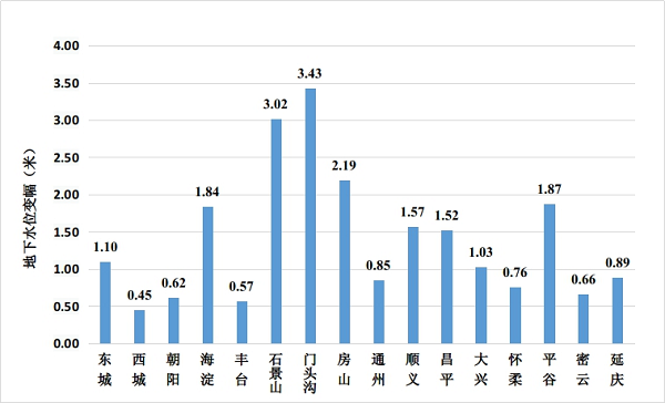 2023年8月24日,全市平原区地下水平均埋深为15.75米,与强降雨前(7月29日)相比,全市平原区地下水水位平均回升1.22米,地下水储量增加6.2亿立方米,全市16个区地下水水位普遍回升,其中门头沟区、石景山区和房山区回升较大。全市及各区地下水水位变化情况如下。