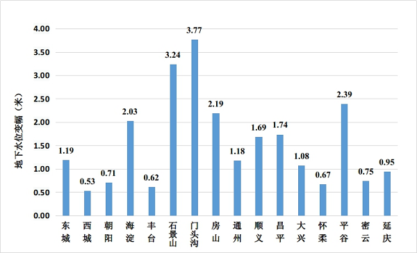 2023年8月30日,全市平原区地下水平均埋深为15.60米,与强降雨前(7月30日)相比,全市平原区地下水水位平均回升1.37米,地下水储量增加7.0亿立方米,全市16个区地下水水位普遍回升,其中门头沟区、石景山区和房山区回升较大。全市及各区地下水水位变化情况如下。