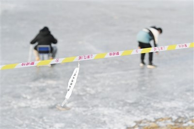 南护城河段设有多处警示标语,如“当心落水”“禁止翻越”等,此外河道上每间隔几百米就设警戒线。但记者看到,有人视若无睹地越过警戒线,一处警戒线附近有三四个人在滑冰。