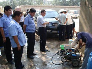 本站讯 9月13日,市水政监察大队第一分队联合石景山区水政监察大队、区城管大队、区节水办、区电视台、区工商局,共同对石景山区苹果园地区的洗车行进行检查。