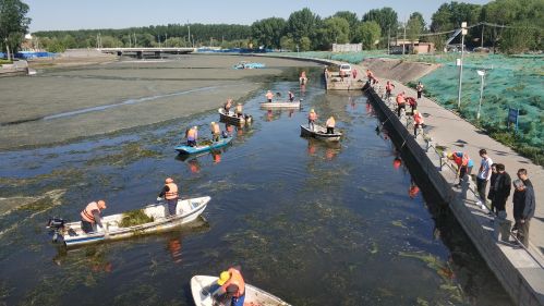 潮白河管理段动员最大力量每天组织2条收割船,8条人工打捞船,3个作业组,共计50余名工作人员同时在潮白河、减河等重点地段开始进行收割、打捞工作。将水草的上半部分收割,还水面清洁,同时保留水下水草根茎,形成“水下森林”,保持水质。