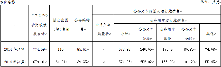 2014年“三公”经费财政拨款决算数679.01万元,比2014年“三公”经费财政拨款年初预算774.59万元减少95.58万元。其中: